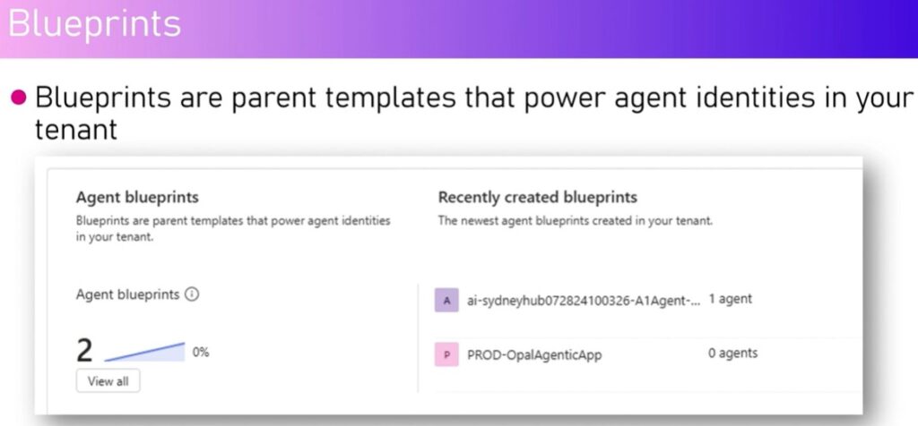 Agent identities are provisioned from blueprints. A blueprint acts as a parent template that powers agent identities within a tenant. Every agent created is associated with an agent identity, and that identity is derived from a blueprint.
